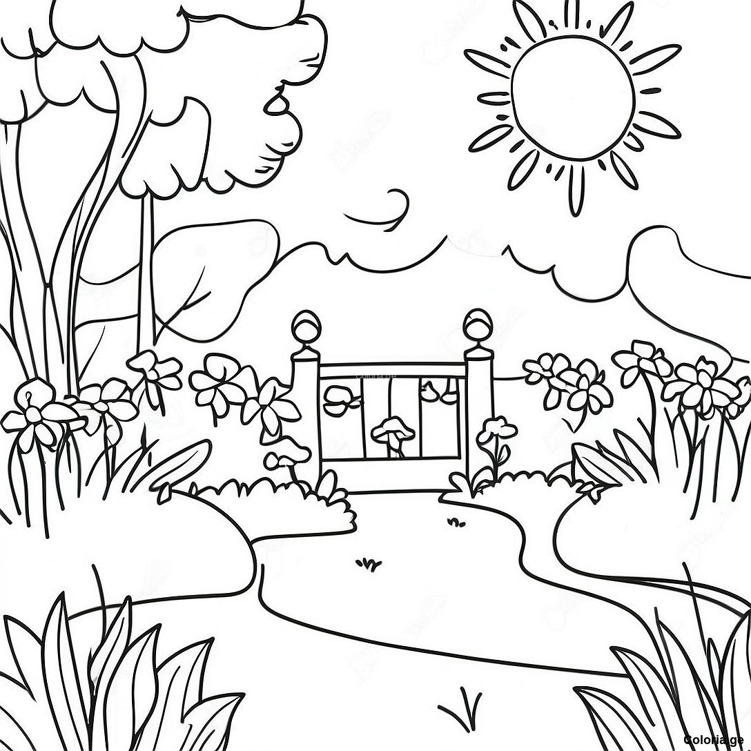Télécharger le PDF imprimable de Page À Colorier De Scène De Jardin Par Une Journée Ensoleillée