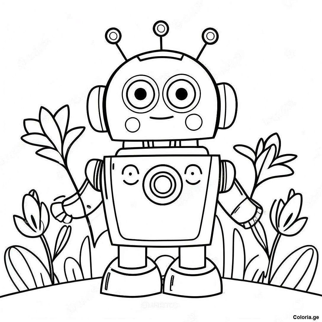Page A Colorier Du Robot Amical Avec Des Fleurs
