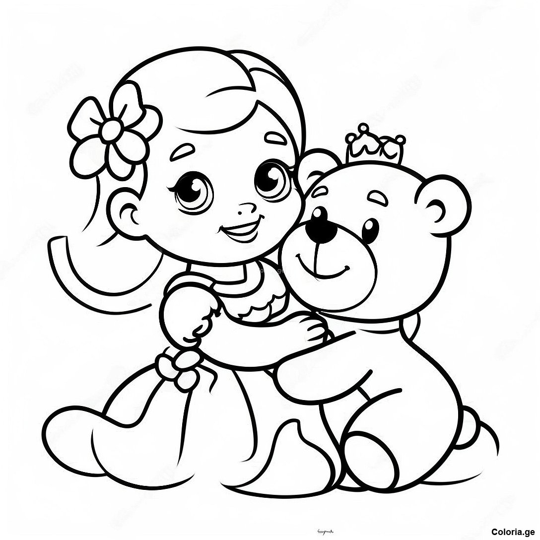 Page De Coloriage De La Petite Princesse Joueuse Avec Un Ours En Peluche