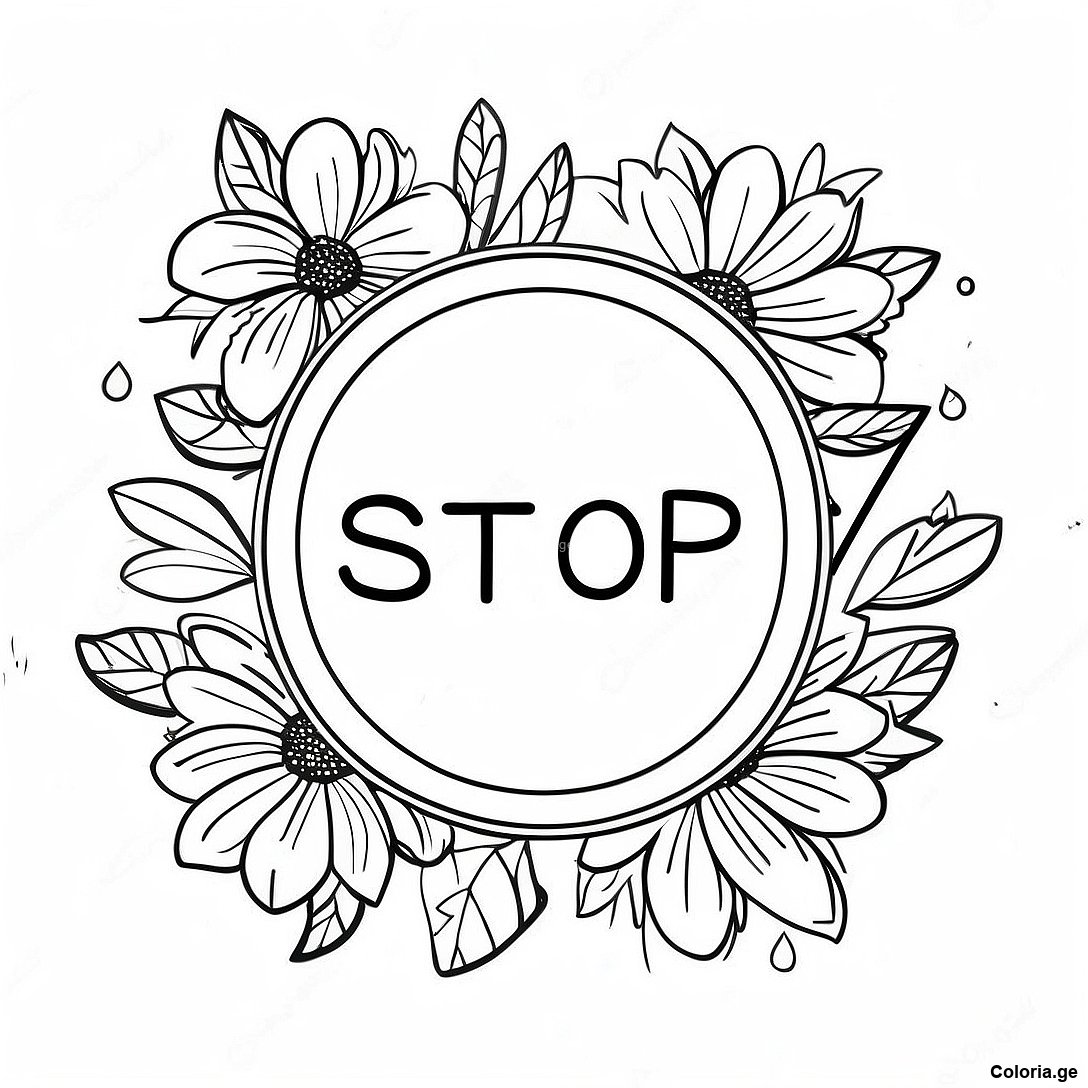 Télécharger le PDF imprimable de Page De Coloriage De Panneau D'arrêt Entouré De Fleurs