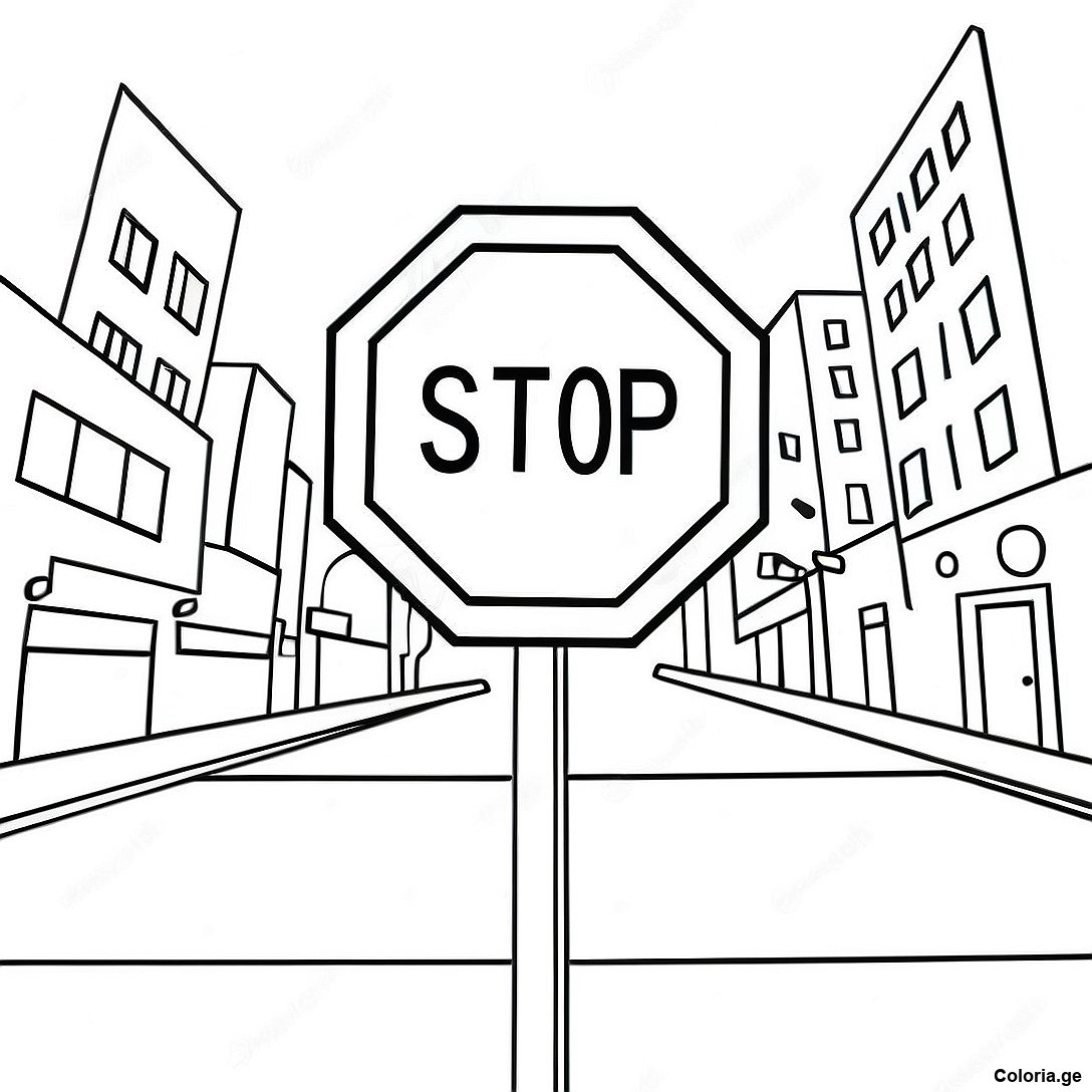 Télécharger le PDF imprimable de Page De Coloriage Du Panneau D'arrêt Cartoon Dans Une Ville